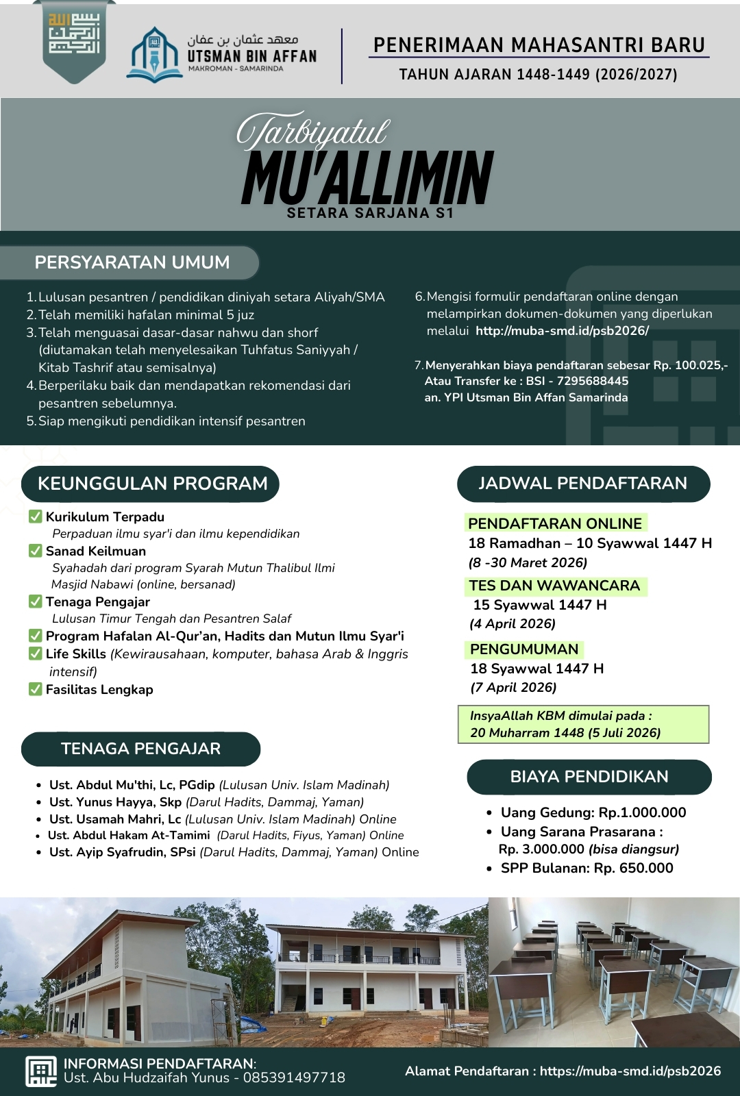 Beranda SELAMAT DATANG MA'HAD UTSMAN BIN AFFAN MAKROMAN Pendaftaran Ulang Santri/Wati DAFTAR ULANG Jenjang Pendidikan 'ULYA LIL FATAYAT (PUTRI) Jenjang setara Aliyah/SMA (Khusus Putri) dengan lama belajar 3 Tahun dan sistem Full Boarding School (Asrama) TARBIYATUL MU'ALLIMIN Jenjang setara Strata S1 (Khusus Putra) dengan durasi belajar selama 4 tahun TARBIYATUL MU'ALLIMAT Jenjang setara Strata S1 (Khusus Putri) dengan durasi belajar selama 4 tahun Galeri Ma'had Berita dan Pengumuman Donasi Pembangunan Masjid No Rek. 7295688445 an. YPI Utsman bin Affan