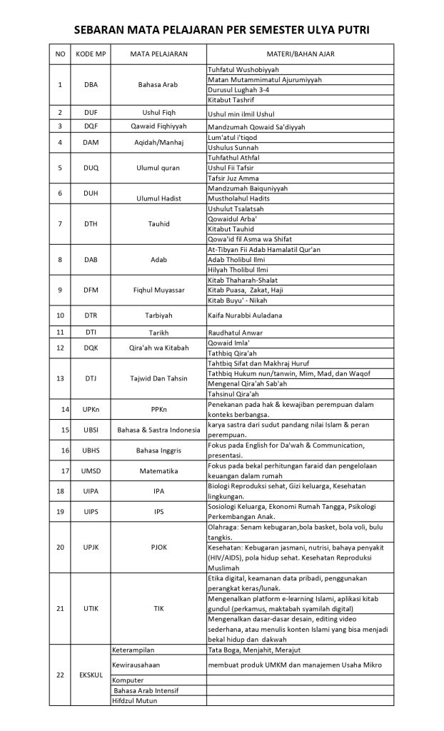 Masa studi Program Ulya Putri ditempuh dalam waktu 3 tahun (6 semester).